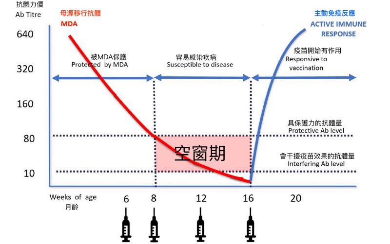 在MDA不足以提供完全的免疫保護但卻仍足以干擾主動免疫反應的時期,則稱為幼犬貓的「易受感染的空窗期」(圖三紅色矩形範圍)。在這個空窗期內,幼犬或幼貓無法通過基礎疫苗接種免疫,如果接觸到高毒性病原體,就容易患病。