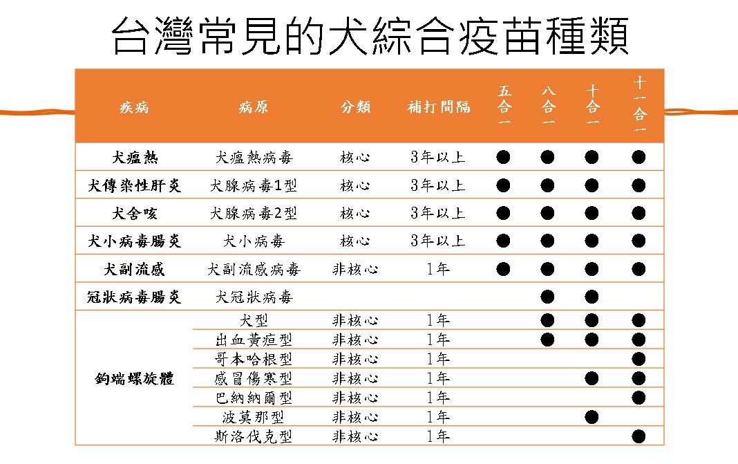 狗狗:施打8合一以上的狗狗,基本上需要每年補強。再視平時生活環境、戶外活動方式,再討論是否需要額外追加鉤端螺旋體疫苗。
