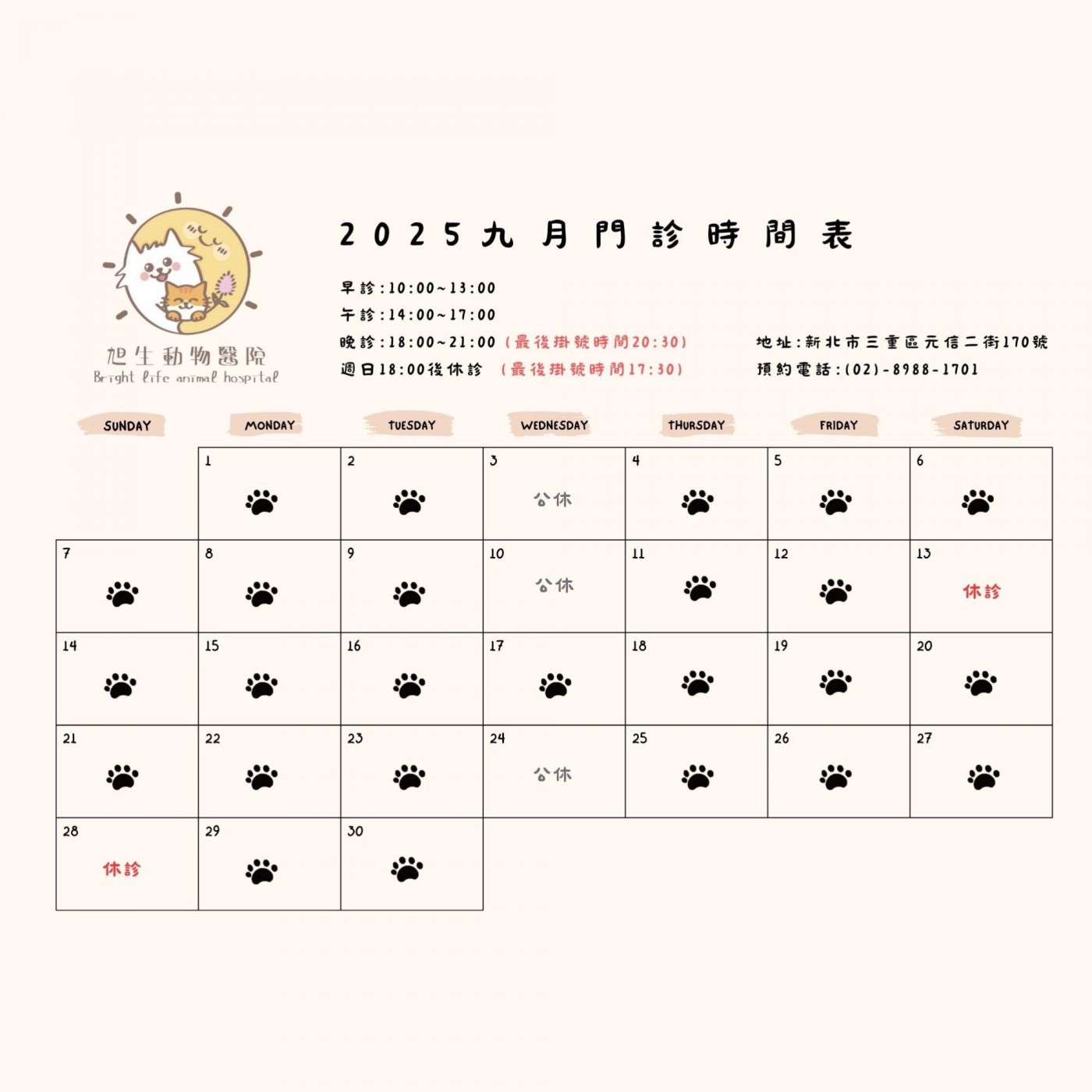 9月28日教師節為國定假日,我們也會額外休診1日。
